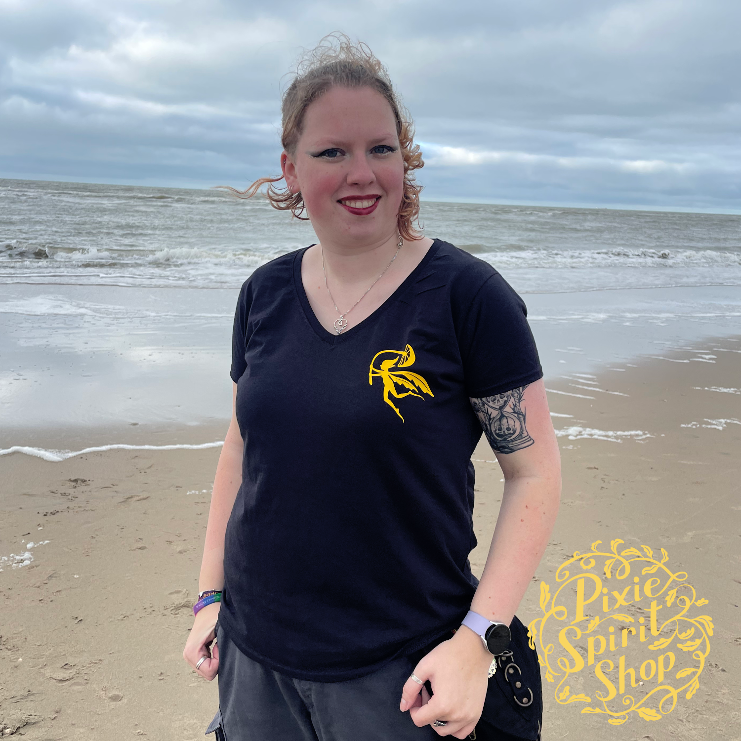 Dames T-shirt V hals - Pixie Spirit Logo rug geel